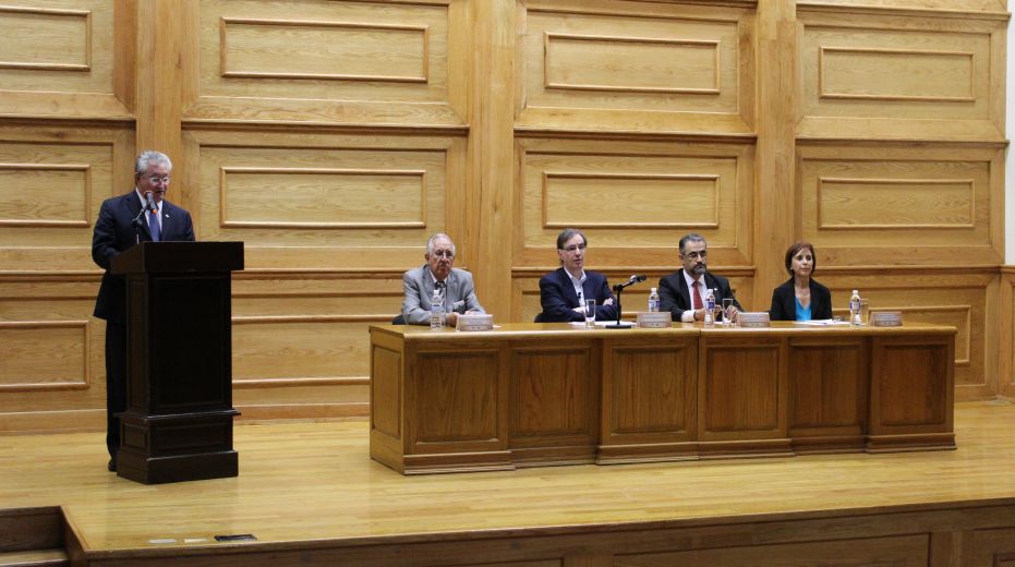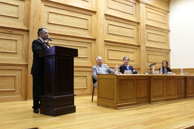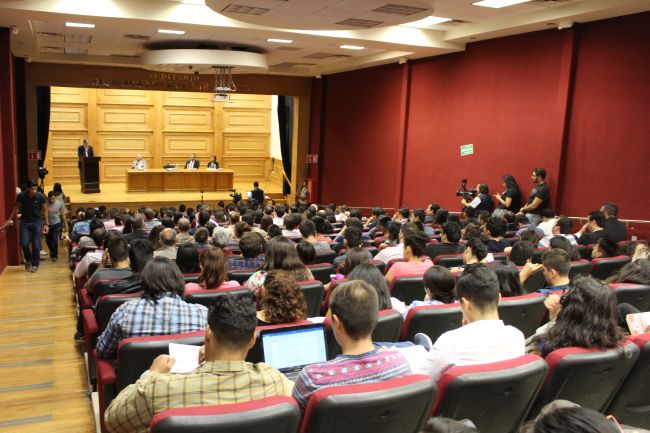 El presídium estuvo compuesto por el Director Interino de la Facultad de Derecho, Lic. Luis Alfonso Rivera, la presidenta del H. Congreso del Estado, Dip. Blanca Gámez, el Consejero Presidente del Instituto Estatal Electoral, Arturo Meraz González y el expositor Dr. Jose Woldenberg Karakowsky.