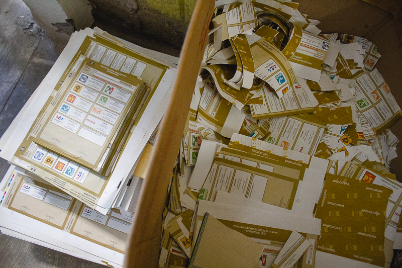 Además, se retiraron todas las boletas electorales que se habían tenido que reimprimir, ya sea por modificaciones o por mandatos propios del Tribunal Electoral, derivados de las impugnaciones que se presentaron durante el proceso electoral. Asimismo, se retiró el material sobrante para posteriormente ser llevado a la Papelera para su destrucción en una tolva.