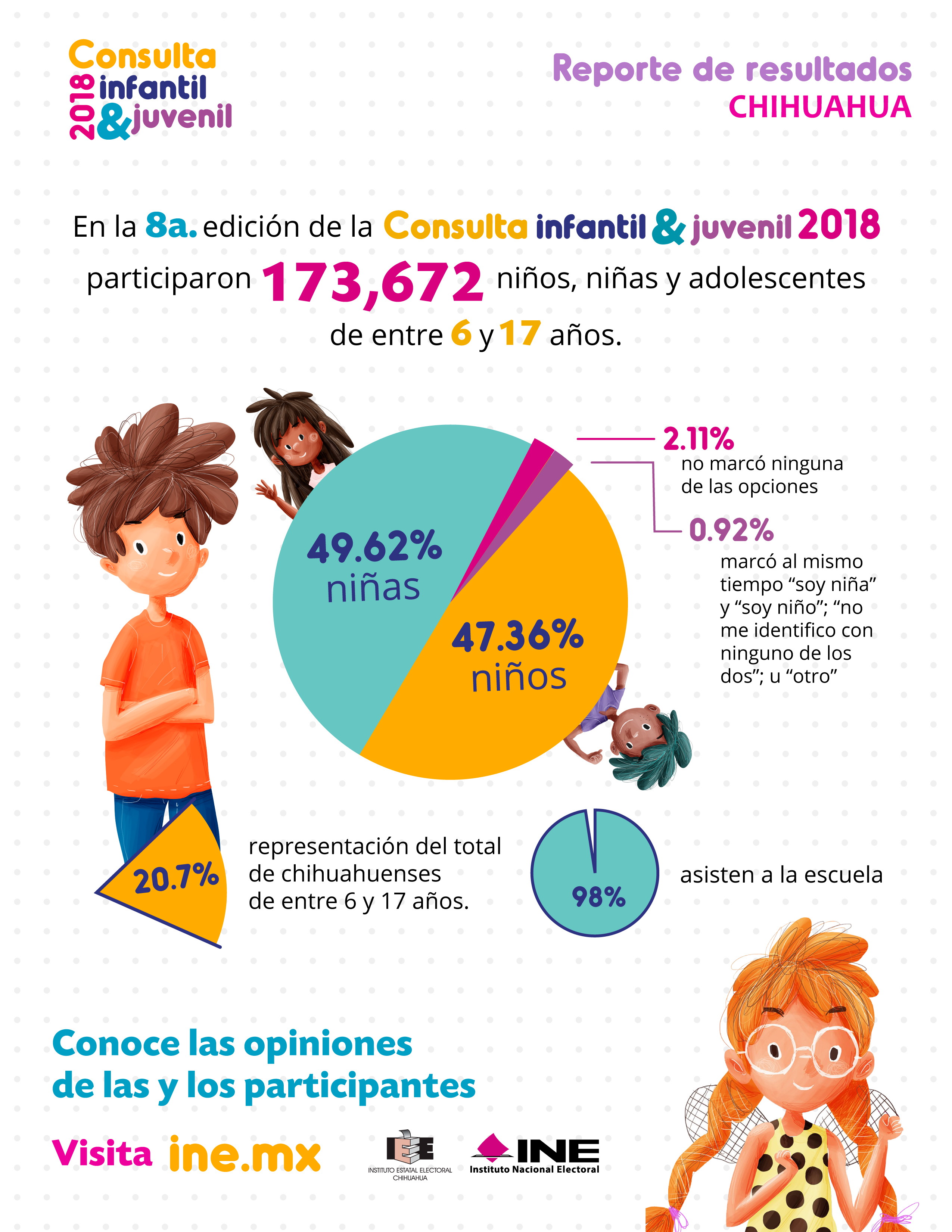 Chihuahua fue una de las entidades en la que se registró una mayor participación de las niñas, niños y adolescentes mediante la boleta electrónica en dispositivos móviles, resaltando que 3.3% de las participaciones en hojas de expresión gráfica corresponden a población indígena que, en un 85.7%, son niños y niñas que asisten a la escuela.