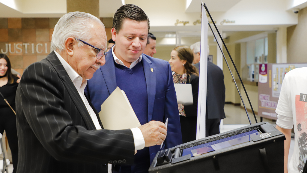 El consejero presidente del IEE acudió a la Facultad de Derecho de la UACH para presentar dos materiales editoriales realizados por el órgano electoral: la revista Ruta Ciudadana y el libro Elecciones 2018: Memorias de un Proceso Inédito; donde además se hizo una demostración de las urnas electrónicas que se utilizarán en el Plebiscito Chihuahua 2019.