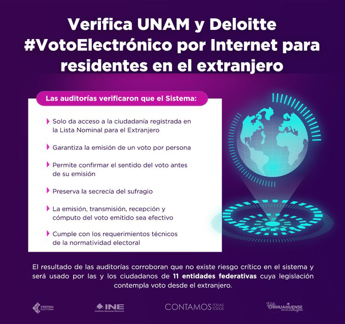 La auditoría ha resultado positiva: se garantizan la confidencialidad y la certeza de los posibles electores del extranjero; se deslinda la información de la persona del voto emitido; se evita la duplicidad y se obtiene la confirmación a través de un recibo con un folio donde se puede constatar que el voto será contado.