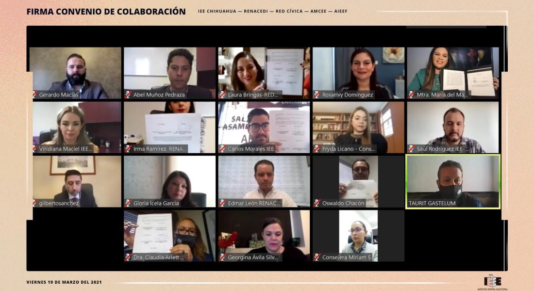 Chihuahua, Chih. — Como un modelo de participación interinstitucional en el país, el Instituto Estatal Electoral de Chihuahua (IEE), la Red Nacional de Consejeras y Consejeros Estatales Electorales por una Democracia Incluyente (Renacedi), Red Cívica, la Asociación Mexicana de Cosejeras Estatales Electorales (AMCEE) y la Asociación de Instituciones Electorales de Entidades Federativas (AIEEF), firmaron un convenio sin precedentes, donde se comprometieron a colaborar en temáticas que favorezcan a la democracia en la defensa de los derechos humanos de la ciudadanía.