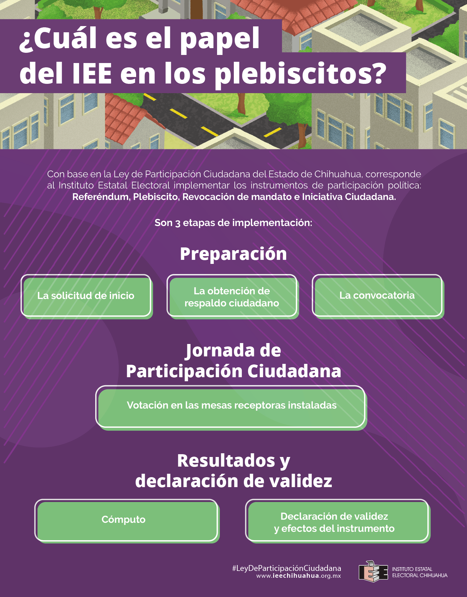 AVISO:El 28 de agosto del presente año, los promoventes de la solicitud de plebiscito, radicado en el expediente de clave IEE-IPC-02/2020, desistieron de su solicitud; por lo anterior, este instrumento de participación ciudadana se da por concluido, por acuerdo del Consejo Estatal de este Instituto, de clave IEE/CE48/2020.
